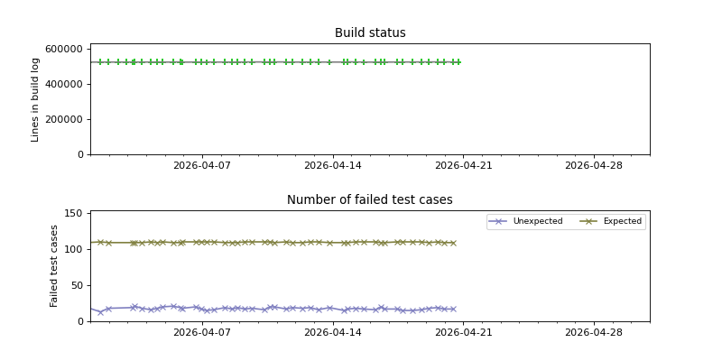 The plots are constructed by looking for changes in the success/failure status of the periodic builds as well as significant changes in the size of the build log, and then pinpointing the time when the change occurred using binary search. Note that this is not guaranteed to find every build failure, because it can miss cases where the build is broken and then fixed again between two consecutive periodic builds. The converse case, when the build is fixed and then broken again between two consecutive periodic builds, is usually detected because the size of the build log has changed.