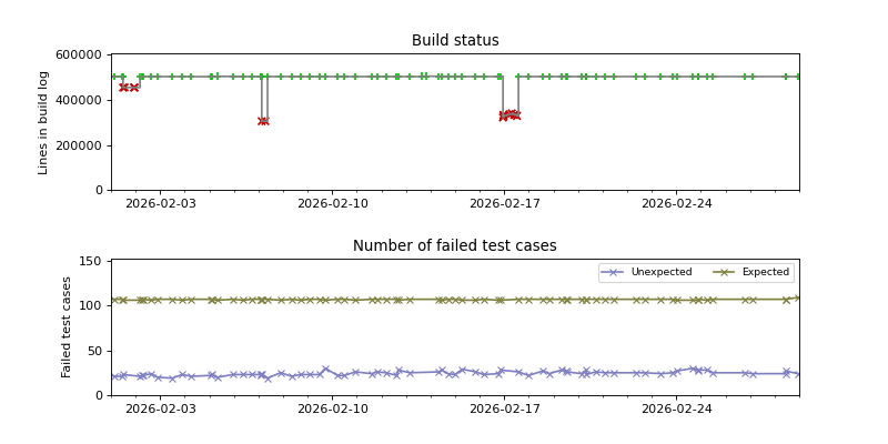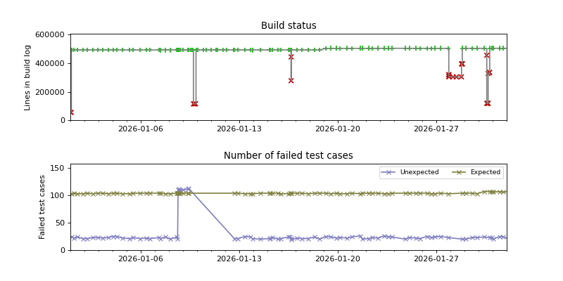 The graphs below visualize the state of the build by plotting the number of lines in the build log from build.sh as a function of the source date, and coloring the points red or green depending on whether the build succeeded or failed.