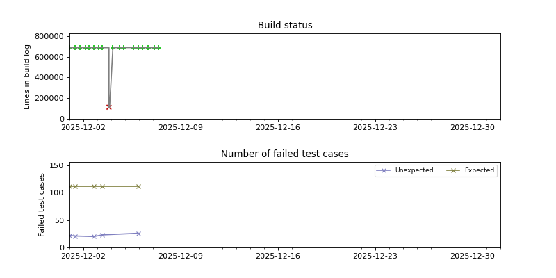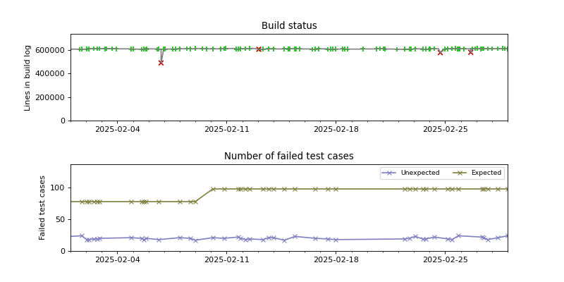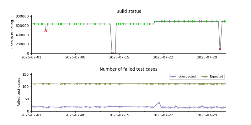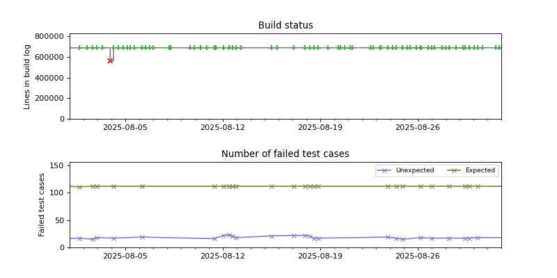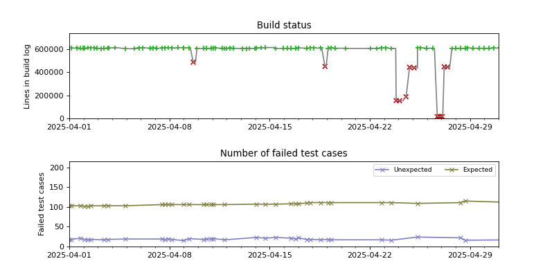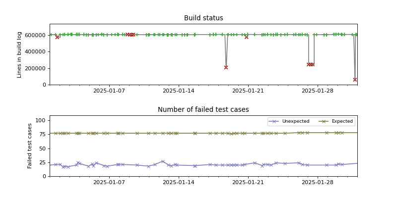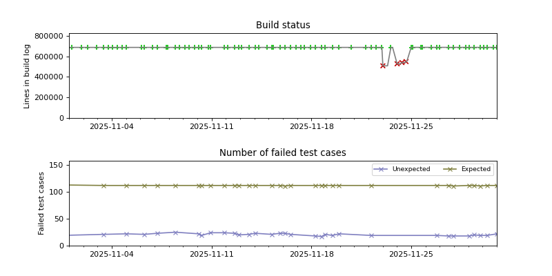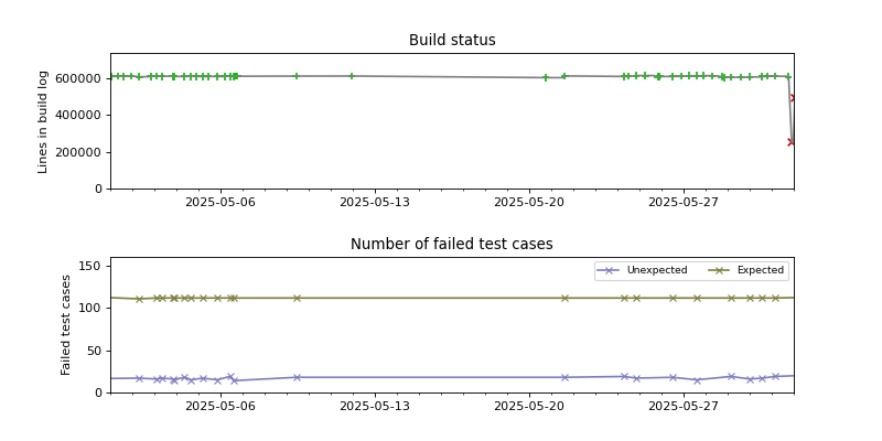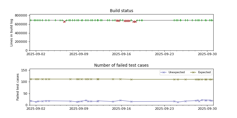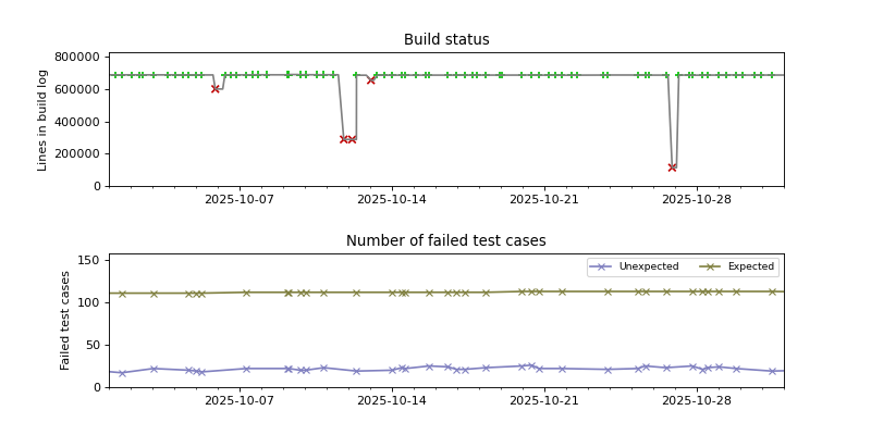 The graphs below visualize the state of the build by plotting the number of lines in the build log from build.sh as a function of the source date, and coloring the points red or green depending on whether the build succeeded or failed.