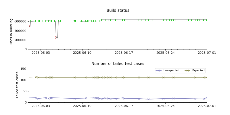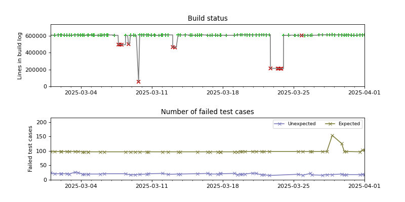 The plots are constructed by looking for changes in the success/failure status of the periodic builds as well as significant changes in the size of the build log, and then pinpointing the time when the change occurred using binary search. Note that this is not guaranteed to find every build failure, because it can miss cases where the build is broken and then fixed again between two consecutive periodic builds. The converse case, when the build is fixed and then broken again between two consecutive periodic builds, is usually detected because the size of the build log has changed.