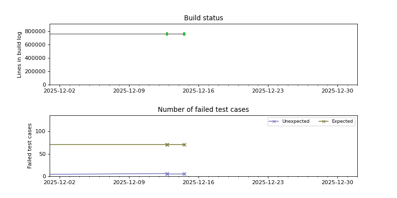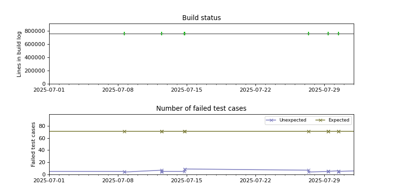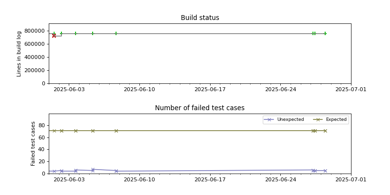 The plots are constructed by looking for changes in the success/failure status of the periodic builds as well as significant changes in the size of the build log, and then pinpointing the time when the change occurred using binary search. Note that this is not guaranteed to find every build failure, because it can miss cases where the build is broken and then fixed again between two consecutive periodic builds. The converse case, when the build is fixed and then broken again between two consecutive periodic builds, is usually detected because the size of the build log has changed.