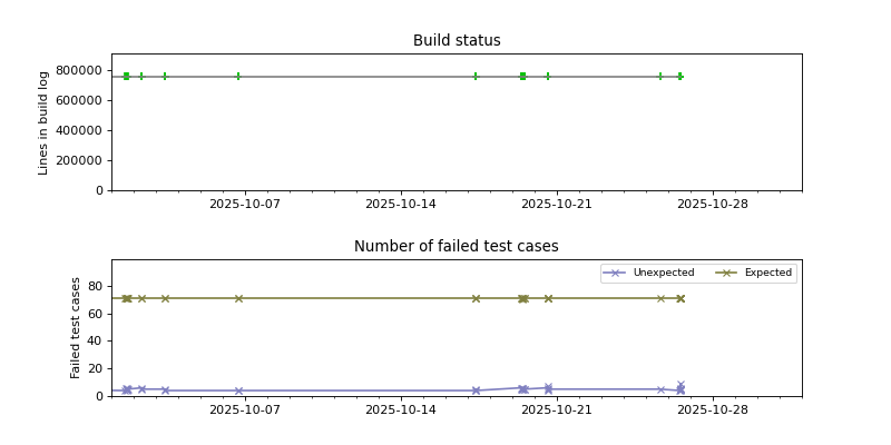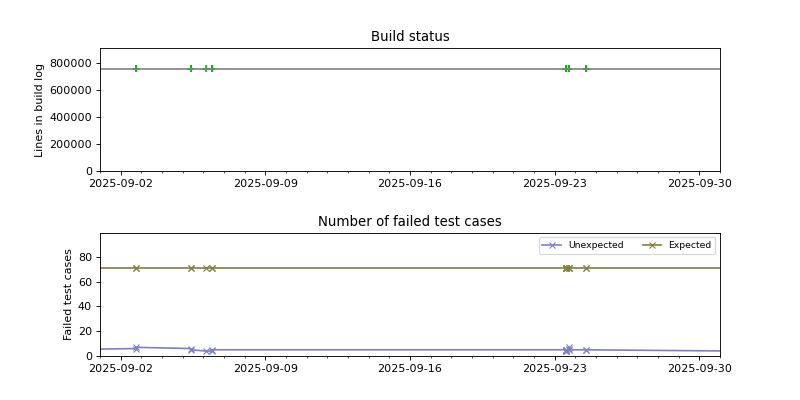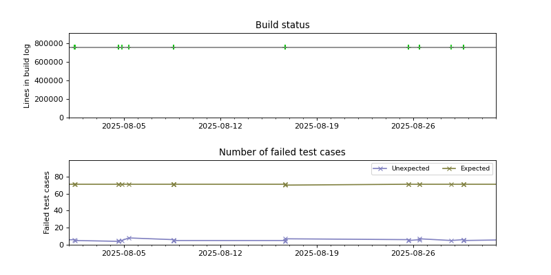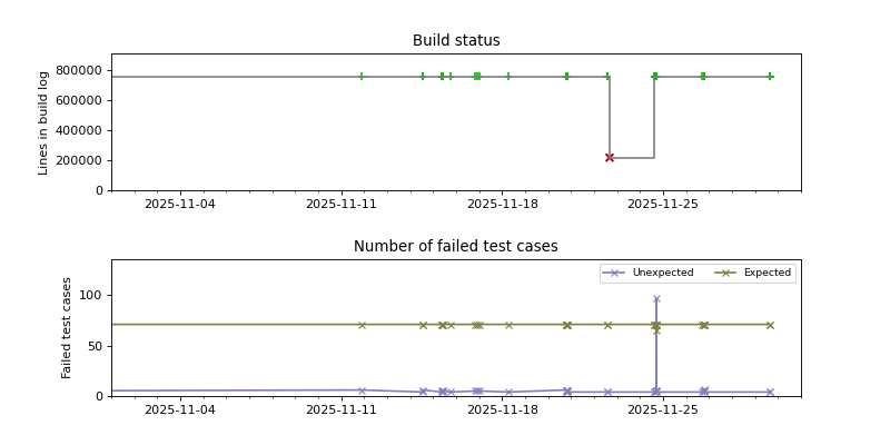 The graphs below visualize the state of the build by plotting the number of lines in the build log from build.sh as a function of the source date, and coloring the points red or green depending on whether the build succeeded or failed.