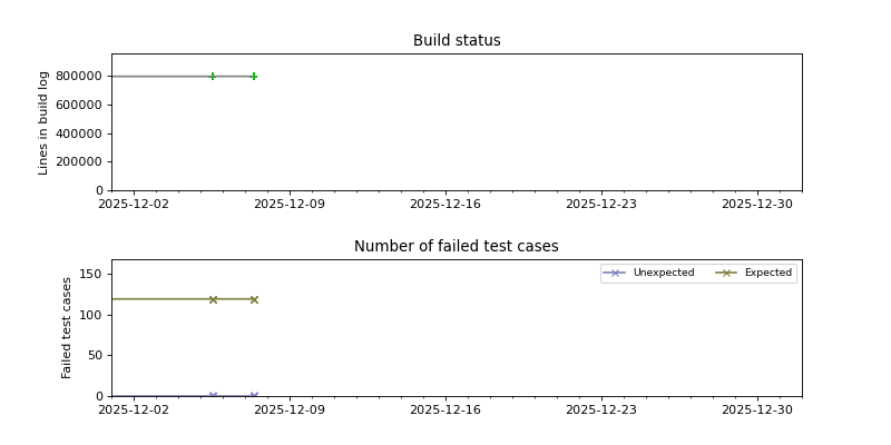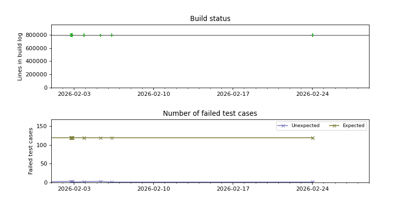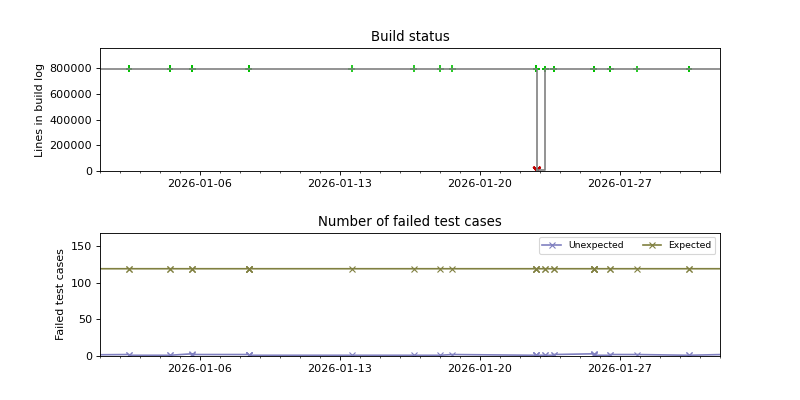 The graphs below visualize the state of the build by plotting the number of lines in the build log from build.sh as a function of the source date, and coloring the points red or green depending on whether the build succeeded or failed.
