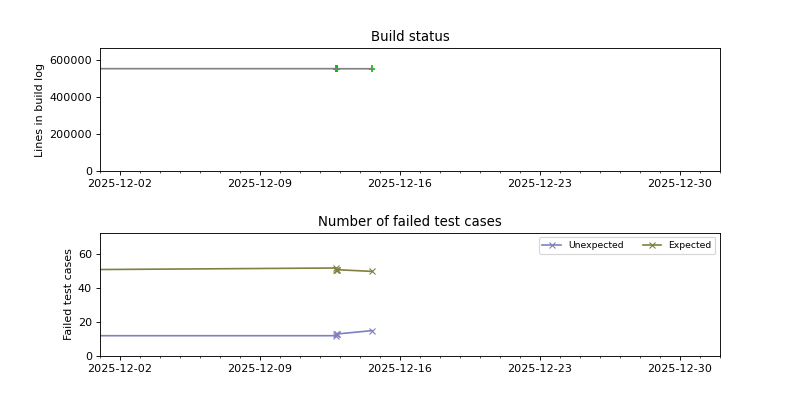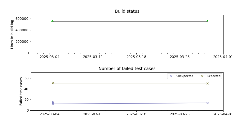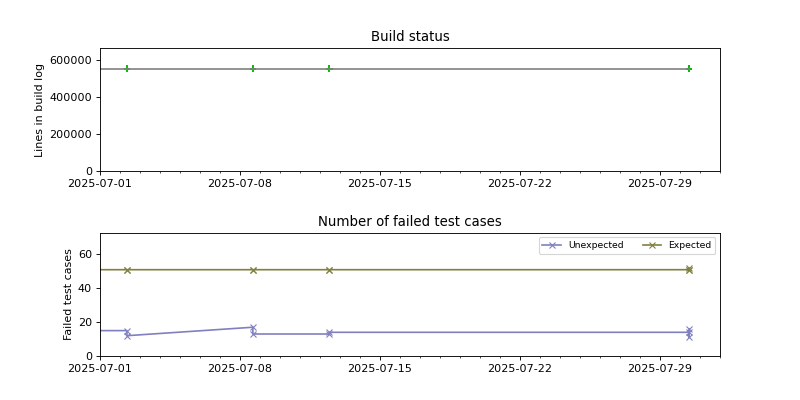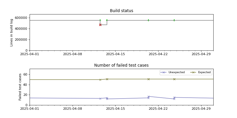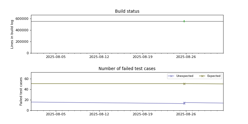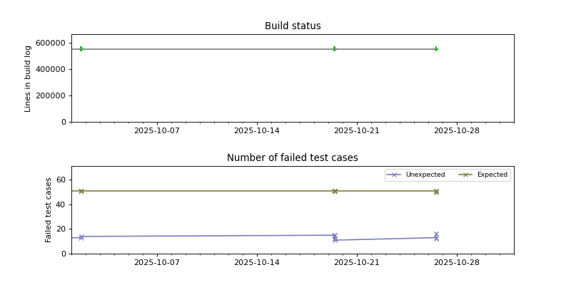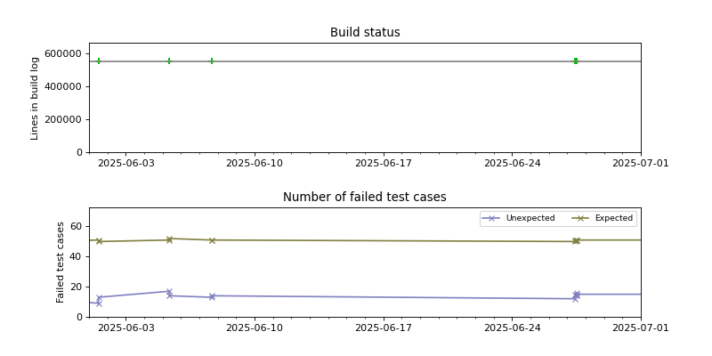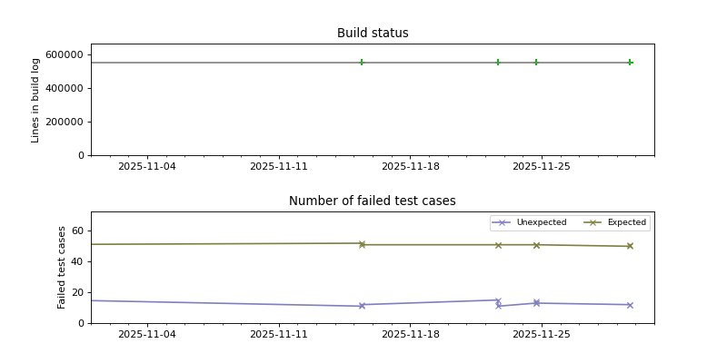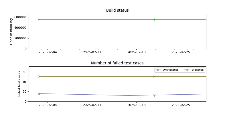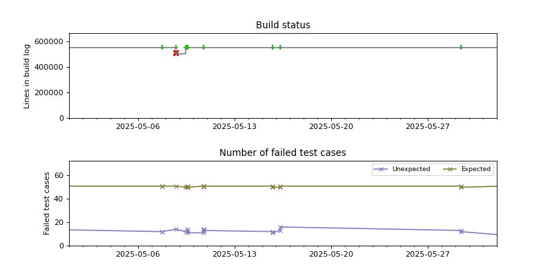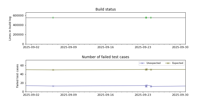 The graphs below visualize the state of the build by plotting the number of lines in the build log from build.sh as a function of the source date, and coloring the points red or green depending on whether the build succeeded or failed.