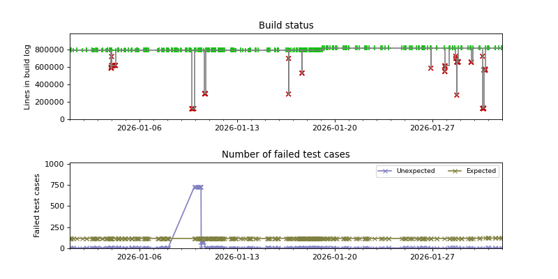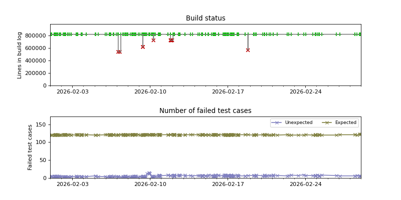 The graphs below visualize the state of the build by plotting the number of lines in the build log from build.sh as a function of the source date, and coloring the points red or green depending on whether the build succeeded or failed.
