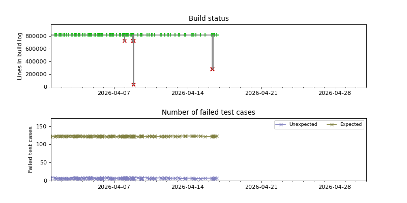 The plots are constructed by looking for changes in the success/failure status of the periodic builds as well as significant changes in the size of the build log, and then pinpointing the time when the change occurred using binary search. Note that this is not guaranteed to find every build failure, because it can miss cases where the build is broken and then fixed again between two consecutive periodic builds. The converse case, when the build is fixed and then broken again between two consecutive periodic builds, is usually detected because the size of the build log has changed.