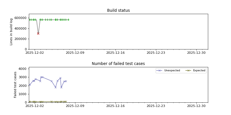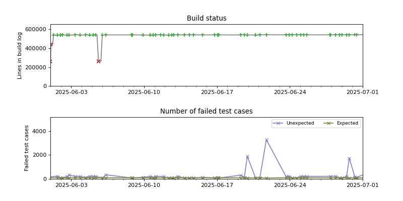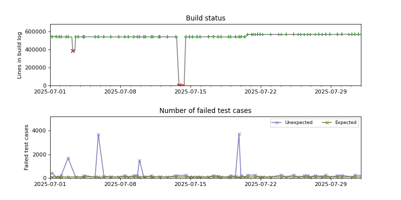 The plots are constructed by looking for changes in the success/failure status of the periodic builds as well as significant changes in the size of the build log, and then pinpointing the time when the change occurred using binary search. Note that this is not guaranteed to find every build failure, because it can miss cases where the build is broken and then fixed again between two consecutive periodic builds. The converse case, when the build is fixed and then broken again between two consecutive periodic builds, is usually detected because the size of the build log has changed.