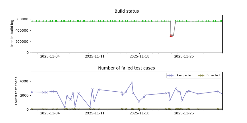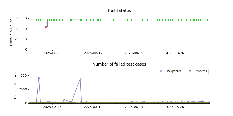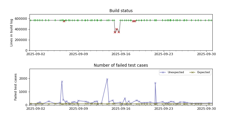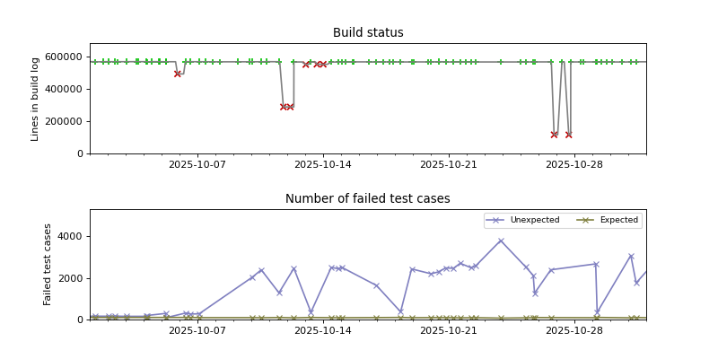 The graphs below visualize the state of the build by plotting the number of lines in the build log from build.sh as a function of the source date, and coloring the points red or green depending on whether the build succeeded or failed.