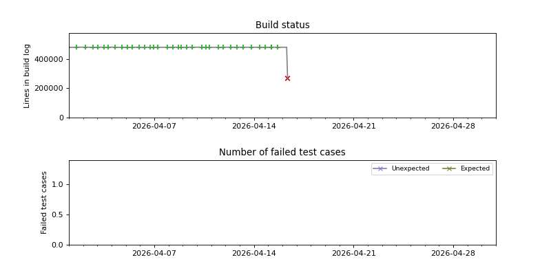 The graphs below visualize the state of the build by plotting the number of lines in the build log from build.sh as a function of the source date, and coloring the points red or green depending on whether the build succeeded or failed.
