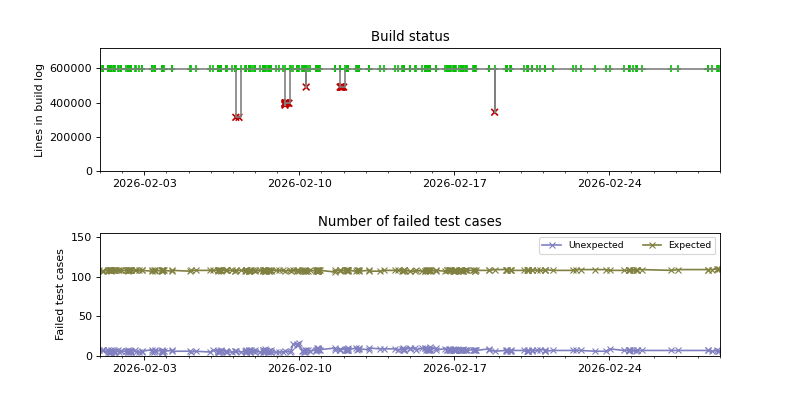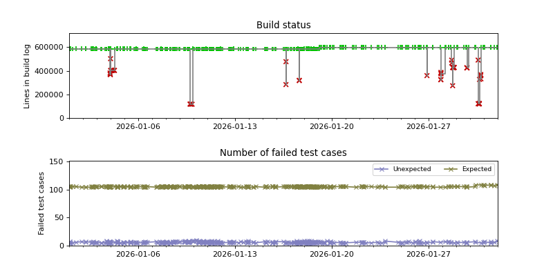 The graphs below visualize the state of the build by plotting the number of lines in the build log from build.sh as a function of the source date, and coloring the points red or green depending on whether the build succeeded or failed.