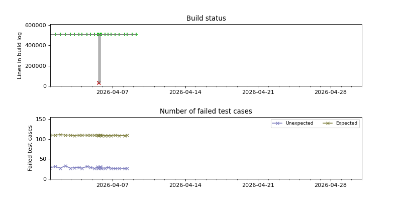 The plots are constructed by looking for changes in the success/failure status of the periodic builds as well as significant changes in the size of the build log, and then pinpointing the time when the change occurred using binary search. Note that this is not guaranteed to find every build failure, because it can miss cases where the build is broken and then fixed again between two consecutive periodic builds. The converse case, when the build is fixed and then broken again between two consecutive periodic builds, is usually detected because the size of the build log has changed.