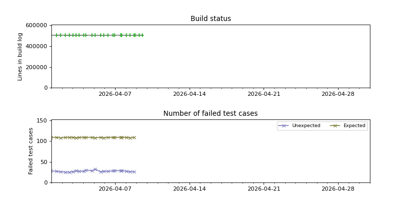 The graphs below visualize the state of the build by plotting the number of lines in the build log from build.sh as a function of the source date, and coloring the points red or green depending on whether the build succeeded or failed.