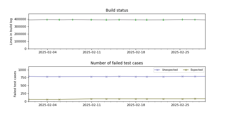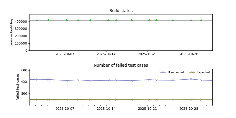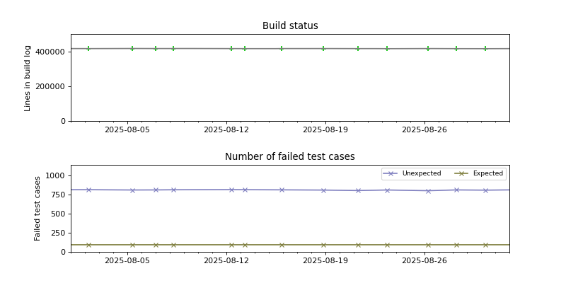 The graphs below visualize the state of the build by plotting the number of lines in the build log from build.sh as a function of the source date, and coloring the points red or green depending on whether the build succeeded or failed.