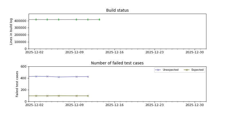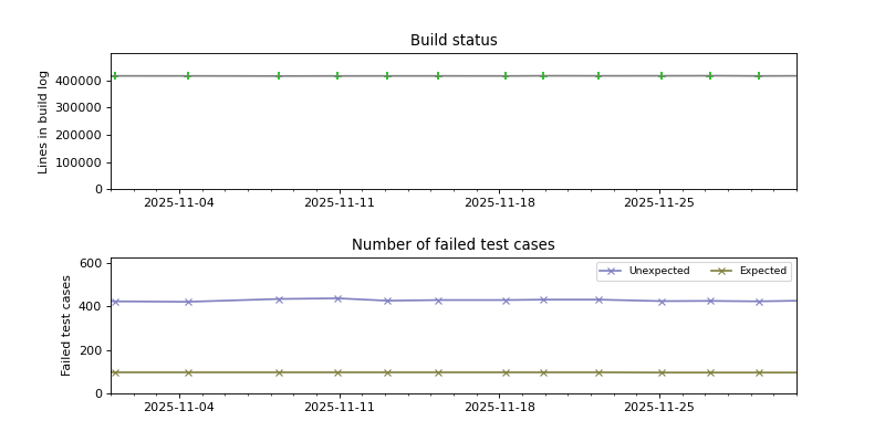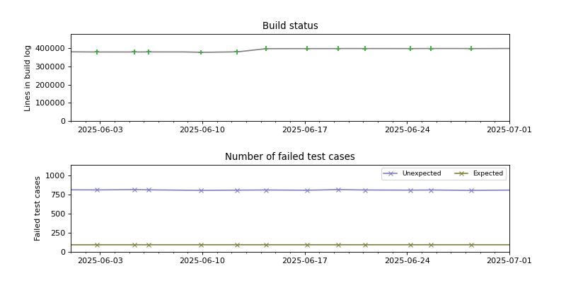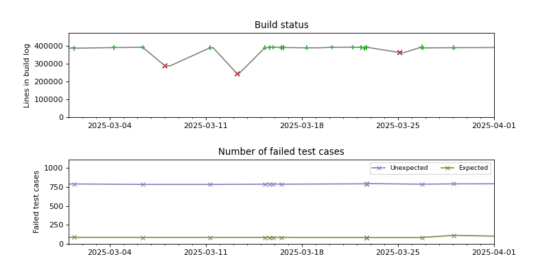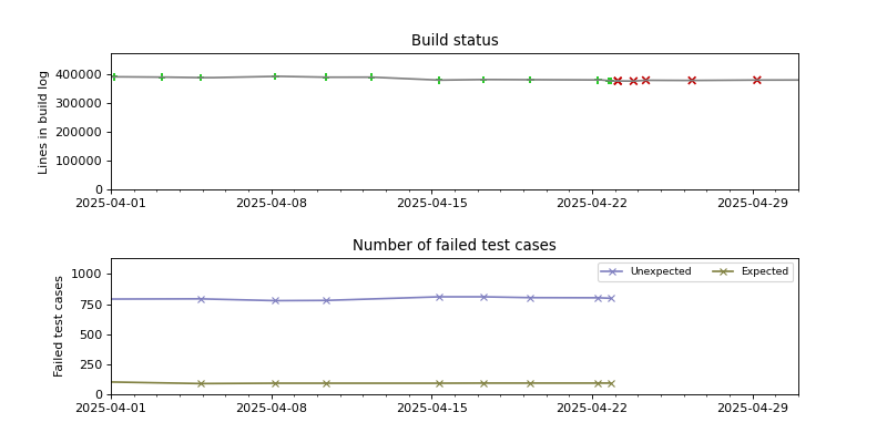 The plots are constructed by looking for changes in the success/failure status of the periodic builds as well as significant changes in the size of the build log, and then pinpointing the time when the change occurred using binary search. Note that this is not guaranteed to find every build failure, because it can miss cases where the build is broken and then fixed again between two consecutive periodic builds. The converse case, when the build is fixed and then broken again between two consecutive periodic builds, is usually detected because the size of the build log has changed.